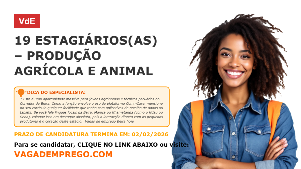 A TechnoServe pretende contratar dezanove (19) Estagiários Agrários para a produção agrícola e animal, baseados nos distritos do corredor da Beira. O projeto aborda as barreiras de produtividade para melhorar a segurança alimentar e nutricional através do aumento da produtividade, rendimentos e empregos.