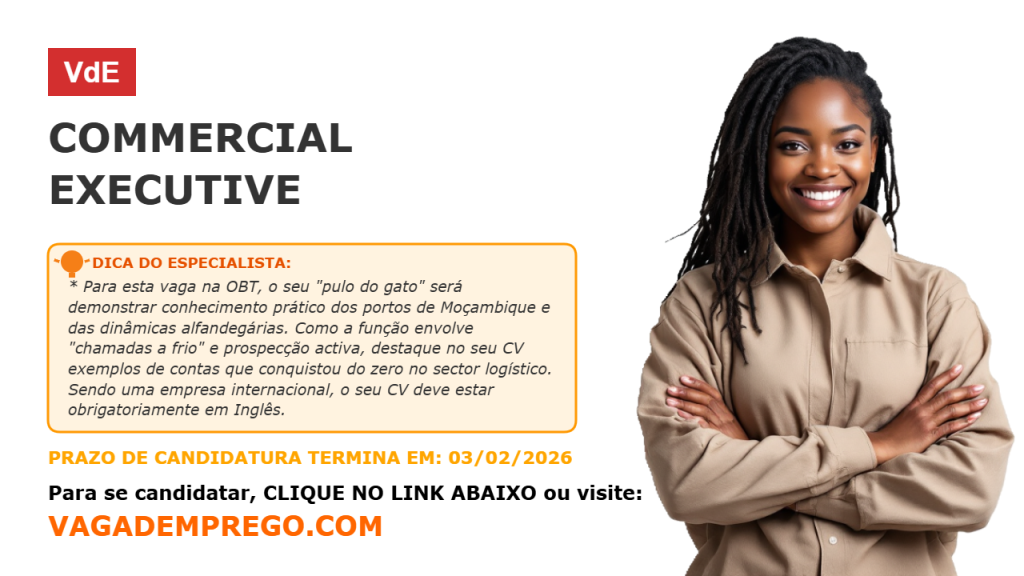 A OBT, uma empresa de logística e marítima bem estabelecida com mais de duas décadas de experiência, está à procura de um Executivo Comercial para fortalecer a sua presença em Moçambique. Esta é uma função prática e voltada para o mercado, focada no desenvolvimento de novos negócios e na gestão de relacionamentos com clientes.