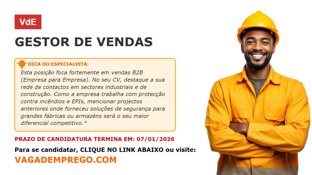 A Cosmos está a recrutar um Gestor de Vendas para liderar a área comercial e impulsionar o crescimento da empresa nos sectores de fire protection, PPE, segurança eletrónica e soluções industriais.