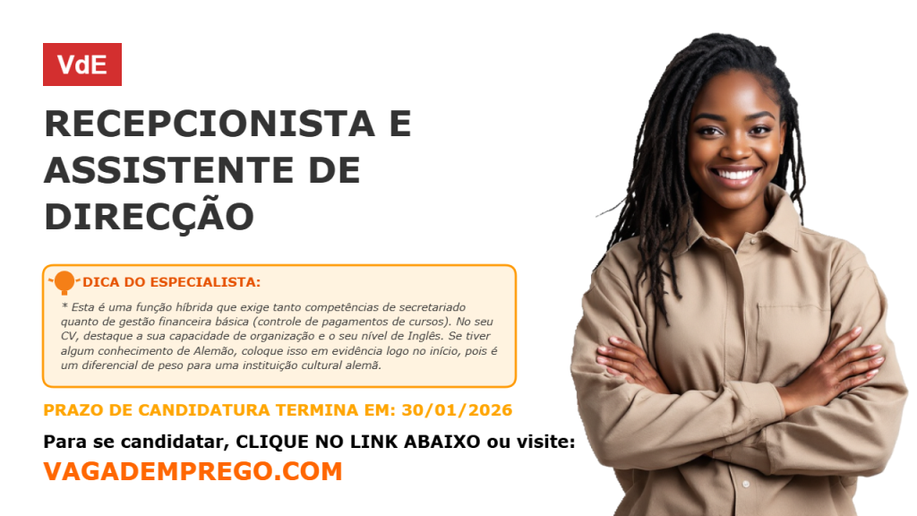O Centro Cultural Moçambicano-Alemão (CCMA) pretende recrutar um(a) Recepcionista e Assistente de Direcção, para desempenhar igualmente funções de Assistente de Coordenação do Departamento de Línguas, prestando apoio administrativo e operacional à coordenação e assegurando o bom funcionamento dos cursos e exames de língua alemã.